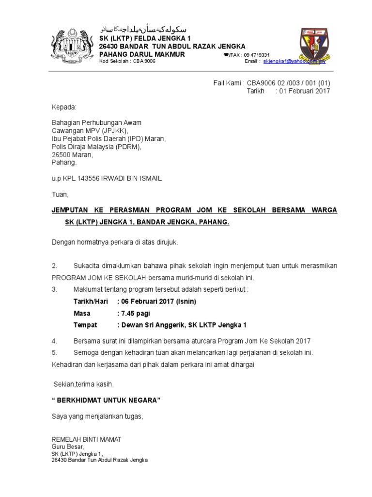 Surat jemputan program jom ke sekolah skpm polis 1. Siti nurfatimah binti hussen setiausaha program berambeh bersama pelajar uum jabatan kebajikan masyarakat bahagian sibu tingkat 6 wisma sanyan no 1 jalan sanyan 96000 sibu tel. Surat rasmi sukan Maslamah Ahmad Razali.